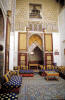 Grâce à notre guide, qui depuis longtemps vivait à Fès, nous avons pu visiter une maison traditionnelle de la vieille ville. Une fois la porte ouverte, on ne voit pas l'intérieur de la maison, car le couloir fait un coude. Ensuite on arrive dans une cour intérieure très ornée qui à proprement parler sert de salle de séjour. La lumière vient d'en-haut. Il n'y a pas de fenêtres et les pièces donnent toutes sur cette cour. Une vieille couturière malade nous accueillit. Elle ne cessa pas de travailler quand nous entrâmes. Elle devait louer les pièces à l'étage en raison de sa pauvreté. Qui en a les moyens quitte la vieille ville pour vivre dans des bâtiments modernes et clairs. Mais la vieille ville reste vivante grâce à l'amabilité de ses habitants et à l'artisanat. Des enfants curieux nous regardaient de l'étage par des fenêtres grillagées